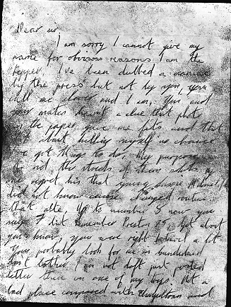I am sorry I cannot give my name for obvious reasons. I am the Ripper. I've been dubbed a maniac by the Press but not by you, you call me clever and I am. You and your mates haven't a clue that photo in the paper gave me fits and that bit about killing myself, no chance. I've got things to do. My purpose to rid the streets of them sluts. My one regret is that young lassie McDonald, did not know cause changed routine that nite. Up to number 8 now you say 7 but remember Preston '75, get about you know. You were right I travel a bit. You probably look for me in Sunderland, don't bother, I am not daft, just posted letter there on one of my trips. Not a bad place compared with Chapeltown and Manningham and other places. Warn whores to keep off streets cause I feel it coming on again.