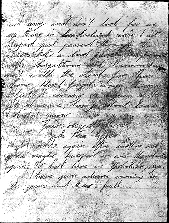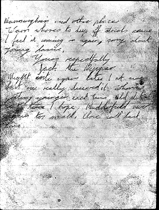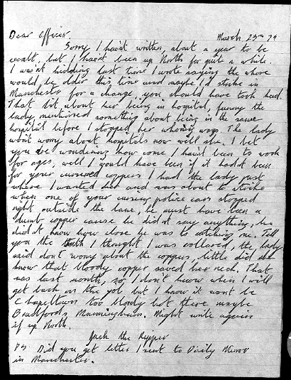 Sorry I havn't written, about a year to be exact, but I hav'nt been up north for quite a while. I was'nt kidding last time I wrote saying the whore would be older this time and maybe I'd strike in Manchester for a change, you should have took heed. That bit about her being in hospital, funny the lady mentioned something about being in hospital before I stopped her whoring ways. The lady won't worry about hospitals now will she. I bet you be wondering how come I hav'nt been to work for ages, well I would have been if it hadnt been for your cursered coppers I had the lady just where I wanted her and was about to strike when one of you cursing police cars stopped right outside the lane, he must have been a dumb copper cause he didnt say anything, he didnt know how close he was to catching me. Tell you the truth I thought I was collared, the lady said don't worry about the coppers, little did she know that bloody copper saved her neck. That was last month, so I don't know when I will get back on the job but I know it wont be Chapeltown too bloody hot there maybe Bradfords Manningham. Might write again if up north.