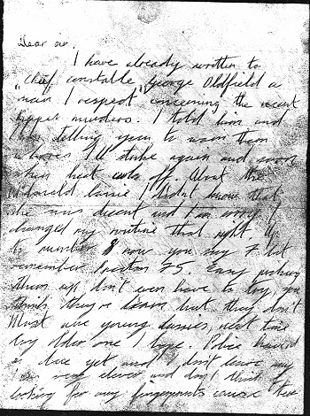 I have already written to Chief Constable George Oldfield "a man I respect" concerning the recent ripper murders. I told him and I am telling you to warn them whores I'll strike again and soon when heat cools off. About the MacDonald lassie, I didn't know that she was decent and I am sorry I changed my routine that night. Up to murder 8 now you say seven but remember Preston '75. Easy picking them up don't even have to try you think they're learn but they don't. Most are young lassies, next time try older one I hope. Police haven't a clue yet and I don't leave any I am very clever and don't look for me up there in Sunderland cause I not stupid just passed through the place not a bad place compared with Chapeltown and Manningham. Can't walk the streets for them whores. Don't forget warn them I feel it coming on again. If I get chance sorry about lassie I didn't know.
