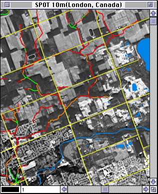 French SPOT satellite imagery of the London, Ontario, area in late spring was obtained to identify and quantify the area of wildlands within 100m of streams. The multi-spectral images are simultaneously collected in 3 wavelength bands: visible green (0.50-0.59 µm), visible red (0.62-0.68 µm) and near infrared (0.79-0.89 µm). Each image has a spatial resolution of 20m (pixel size), but when these images are combined with the panchromatic image, an effective resolution of 10m is obtained. For each pixel, the intensity of each wavelength band is recorded as a digital number from 0 to 255 (reflectance value).