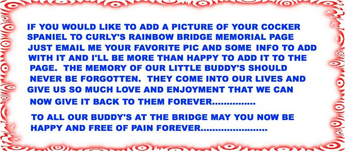 CURLY FOUGHT A BRAVE BATTLE AGAINST CANCER, BUT COULDN'T WIN THIS TIME. CURLY WAS 15 YEARS 9 MONTHS 18 DAYS OLD. CURLY, THANK YOU FOR ALL THE GREAT TIMES WE HAD, YOU WILL ALWAYS BE IN MY HEART UNTIL WE MEET AGAIN AND GO FISHING FOREVER.