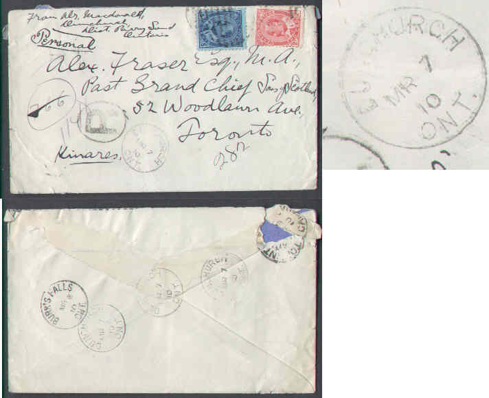 Scan #7312 - 5c + 2c Edward registered - Parry Sound District - Dunchurch , Ont - Mr 7 1910 - $20.00 Cdn -