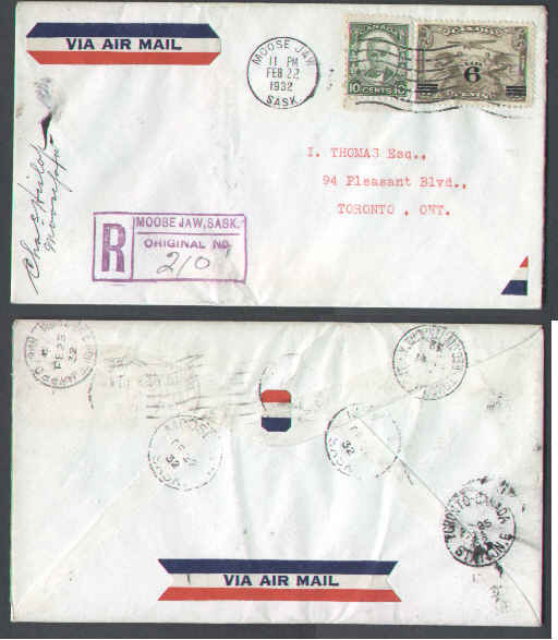Scan #6647 - 10c Cartier + 6c Airmail registered - Moose Jaw , Sask - Fe 22 1932 - $17.50 Cdn - first day of issue of C3 franking - M/S Moose Jaw postmaster signature - B/S Winnipeg & Moose Jaw RPO / No 8 [W191 RF 80] -