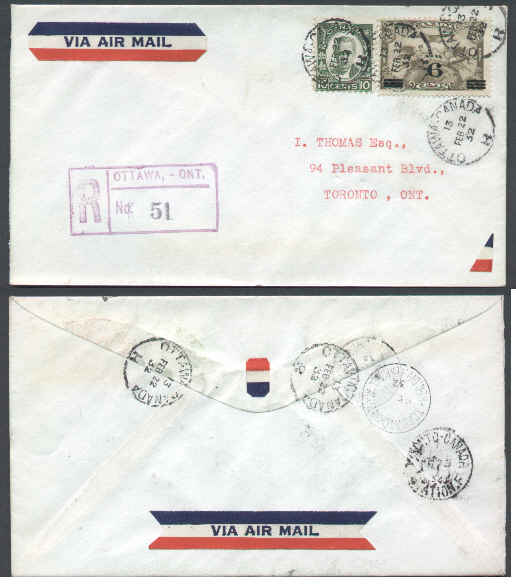 Scan #6648 - 10c Cartier + 6c Airmail registered - Ottawa , Ont - Fe 22 1932 - $15.00 Cdn - first day of issue of C3 franking -