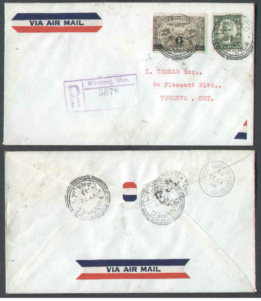 Scan #6640 - 10c Cartier + 6c Airmail registered - Winnipeg , Man - Fe 22 1932 - $20.00 Cdn - first day of issue of C3 franking - B/S Windsor Walker Airport , Fe 23 1932 - NOT available -