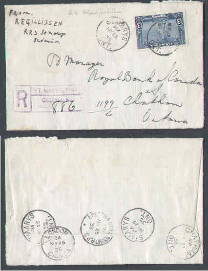 Scan #2425 - 3c (3) KGV registered - Middlesex county - Longwood - Fe 25 1935 - $7.50 Cdn -