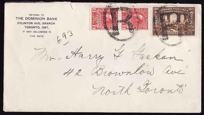 Scan #12363 - 2c(2) Admiral War Tax pair + 3c 1917 Confederation - York County - Postal Station K, Toronto, Ont - De 6 1917 - 7c franking pays the 5c registration rate + 2c drop letter rate - $20.00 Cdn -