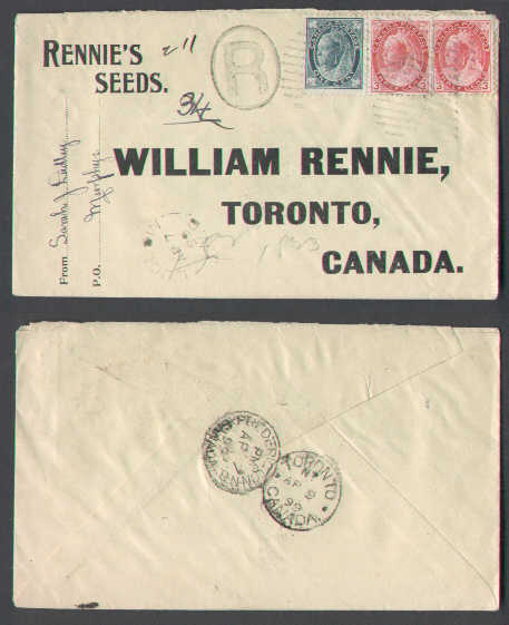 Scan #13106 - 3c[2} + 1c Numerals on a registered cover - Simcoe county - Stayner, Ont cds - Mr 27 1899 - B/S "Hamilton & Allandale / MC [ON 162 RF D ]- S Mr 27 1899" - $20.00 Cdn -