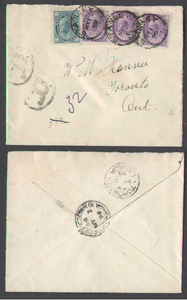 Scan #7120 - 1c + 3c(2) Numerals registered - Lindsay , Ont squared circel B/S - AM / Ap 6 / 1899 - $19.50 Cdn -
