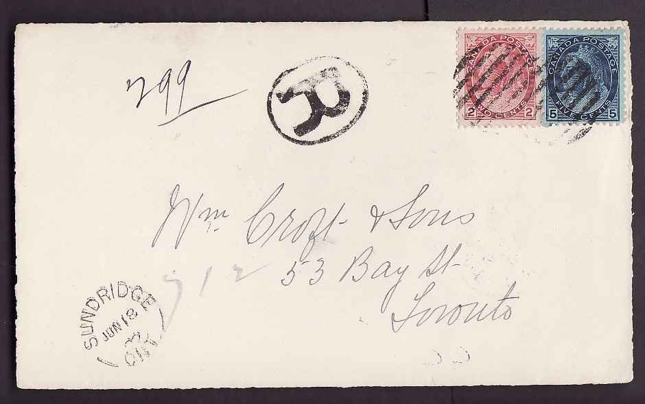 Scan #4614 - 2c + 5c Numeral reg'd [ front only ] - Parry Sound District - Sundridge - Jun 18 1902 - $17.50 Cdn -